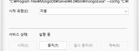 5. 서비스 앱을 실행한 후 서비스 상태 - 시작을 클릭하면 몽고디비는 자동실행된다.