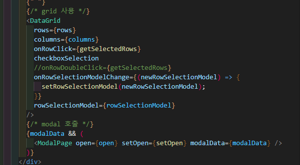 - modal 라이브러리로는 mui의 modal을 사용했는데, mui/material에서 제공해주는 onRowClick(), onRowDoubleClick() 이 있기에 onRowDoubleClick() 에서 onRowClick() 으로 바꿔서 사용했다.