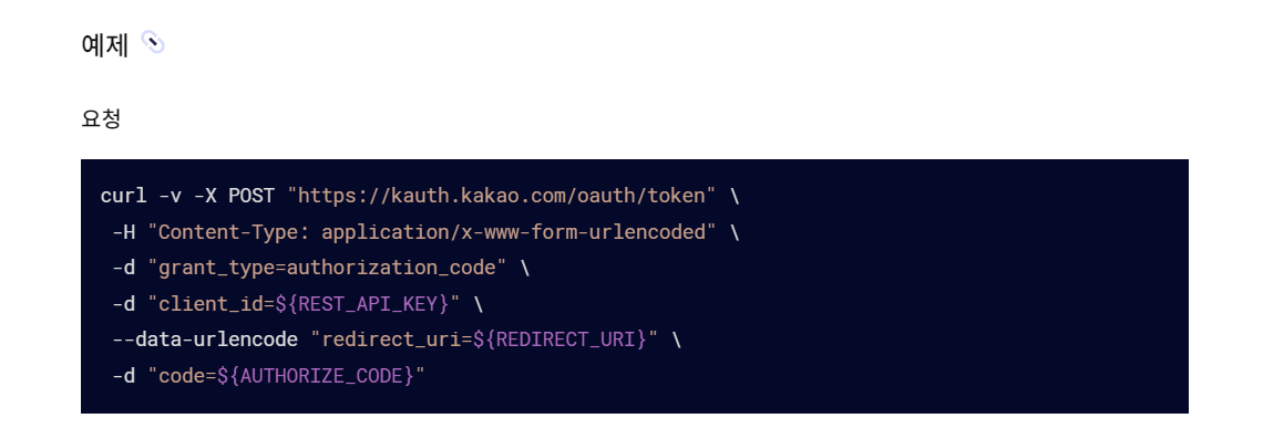 - 카카오 공식문서에 있는 예제이다. rest_api_key와 redirect_uri 그리고 인가코드를 axios를 통해