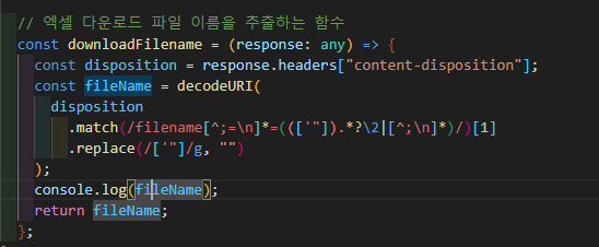 엑셀 다운로드 코드 작업중에 파일이름을 추출하는 함수 부분에서 다음과 같은 에러가 발생하였다.