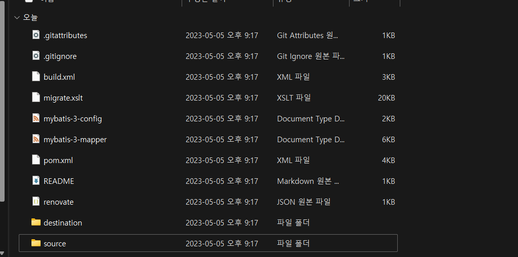 폴더를 클릭하면 destination과 source 폴더가 있는데, source폴더안에 ibatis문법으로 된 xml 파일을 넣으면된다.