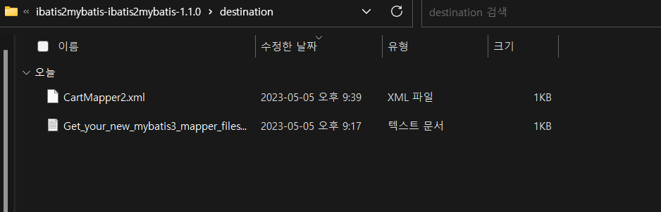 3) cmd 창에서 cd 해당경로를 입력후 ant 라고 입력했을때 정상적으로 실행이 되면 destination 폴더에 mybatis로 바뀐 xml 파일이 생기게 된다.