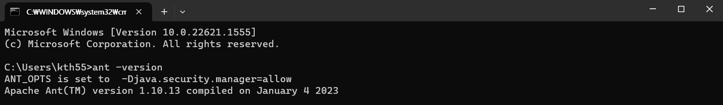 4) cmd(명령프롬포트창)을 열어서 ANT가 제대로 설치되었는지 확인한다.