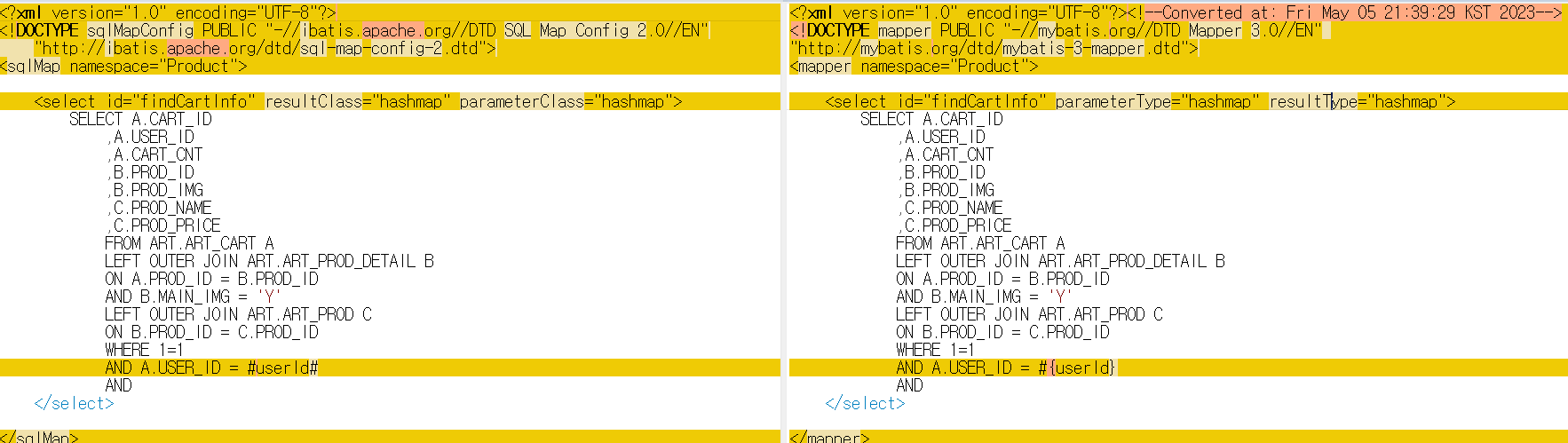 왼쪽에 ibatis.xml을 넣고, 오른쪽에 mybatis.xml을 넣으면 노란색으로 변환된 부분을 알수있다.