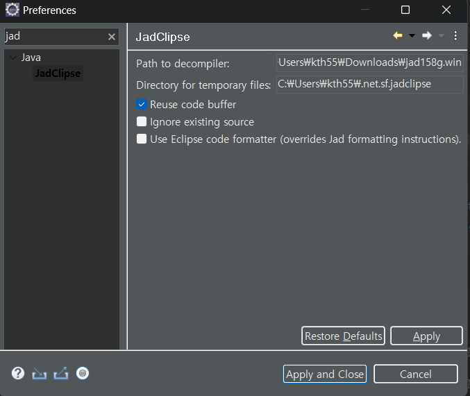 path to decompiler에 jad.exe 경로를 넣어준다.