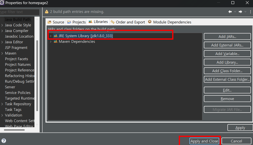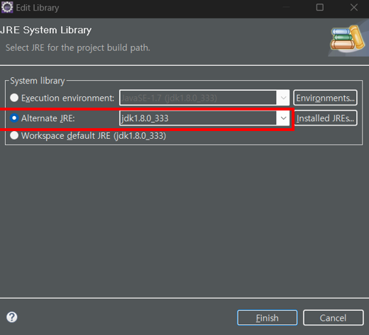 JRE System Library 더블클릭 하면 아래 화면이 뜨는데 Alternate JRE에 jdk 1.8버전으로 변경 후 finish - Apply and Close 클릭