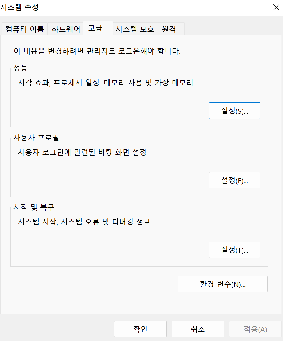 시작 - 검색란에 "시스템 환경변수" 입력 - 시스템 속성이 뜨게됨