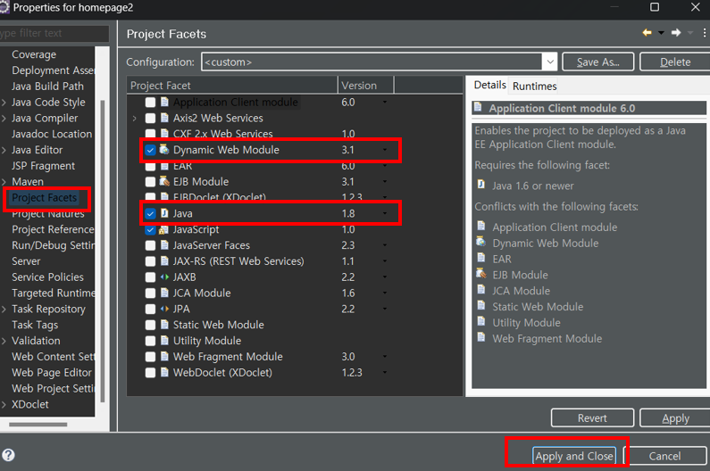 좌측 리스트 중에서 Project facets 을 선택 후