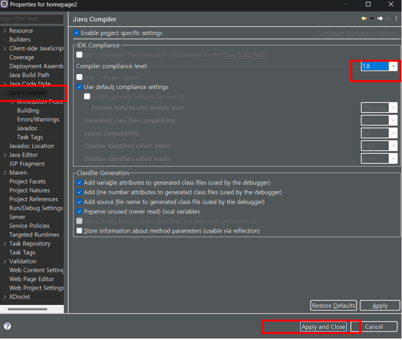좌측 리스트의 java Compiler(자바 컴파일러) 를 선택 후 컴파일 버전이 1.8로 설정되었는지 확인함.