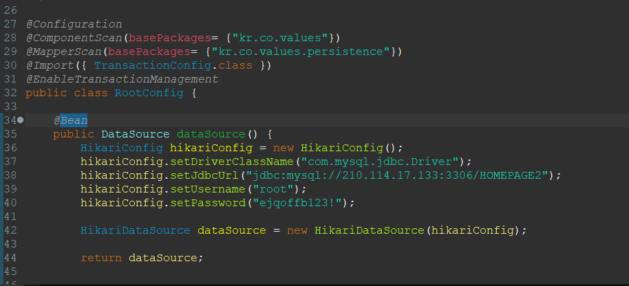 - 트랜잭션 설정 java (TransactionConfig.java) 파일 신규 생성이 완료된 이후 다시 RootConfig.java 설정 파일로 돌아와서 아래 내용을 추가한다.