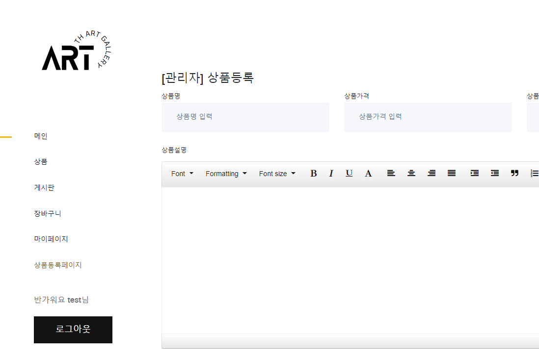 관리자로 로그인 시 노출되는 페이지 "상품등록페이지"