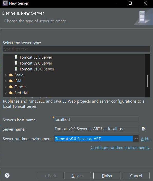 2. Apache Tomcat - Tomcat v9.0 Server 선택 후 새로운 서버 이름 등록 후 Next클릭