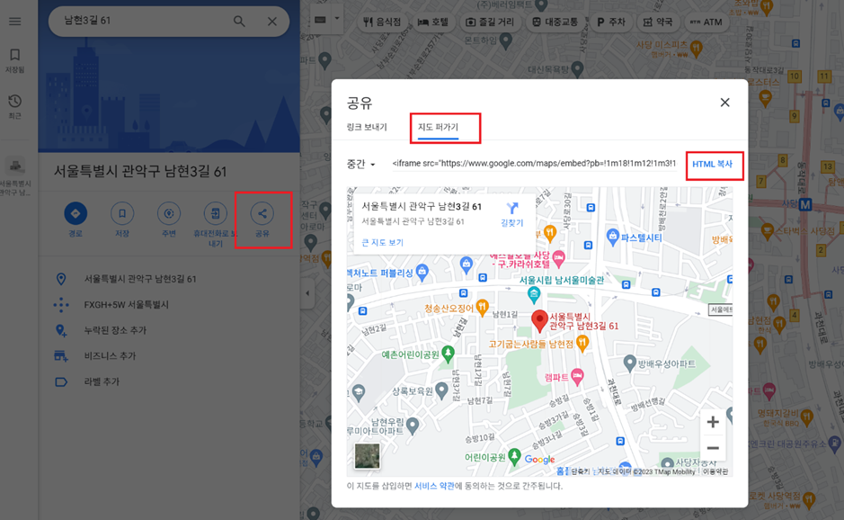 검색할 주소를 입력 후 -> 공유 버튼 클릭 -> 지도 퍼가기 -> HTML 복사