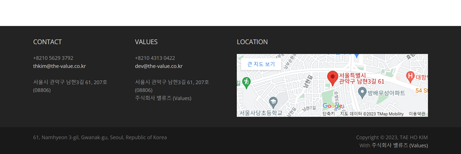 이번 챕터에서는 푸터 페이지의 문구 수정 및 구글 지도를 통한 장소 표시를 하고