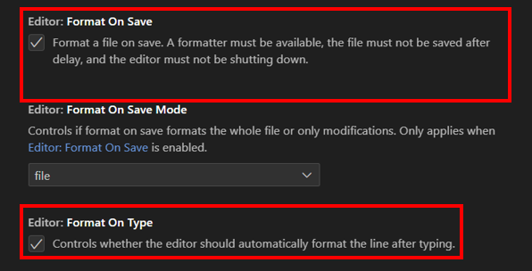 3) 밑에 쪽에 Editor: Format On Save와 Editor:Format On Type을 취향껏 체크해준다.