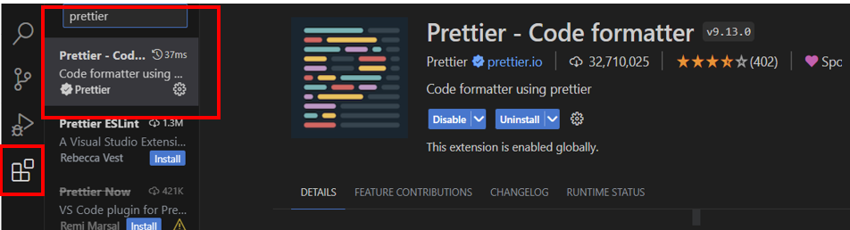 - extenstions에 prettier라고 검색후 install버튼을 눌러 설치해준다.