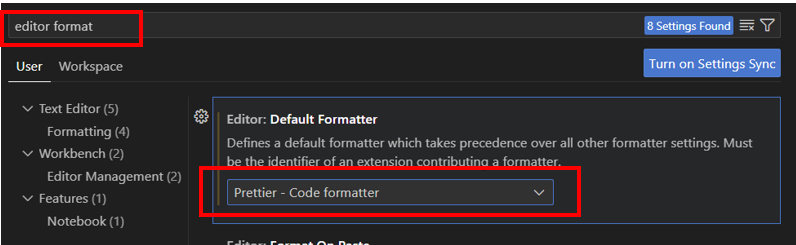 2) 검색란에 editor format을 검색한후 Editor: Default Formatter를 설치한 Prettier로 설정해줌.
