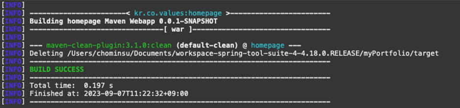 위와 같이 BUILD SUCCESS 문구가 나오면 정상 클린.