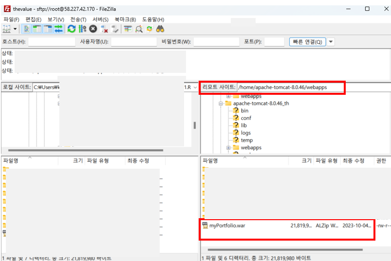 /home/apache-tomcat-8.0.46/webapps에 myProtfolio.war 파일을 넣었다.