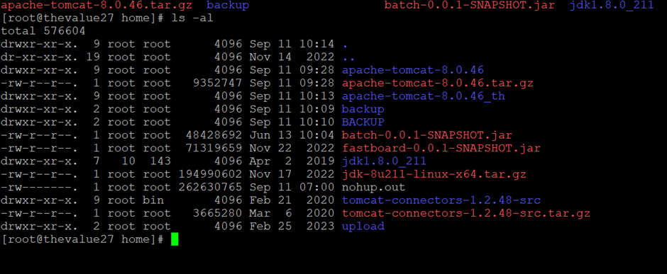 ls 또는 ls -al : 리스트 보기 (현재 접속된 경로의 디렉터리 안에 파일 리스트를 출력한다.)