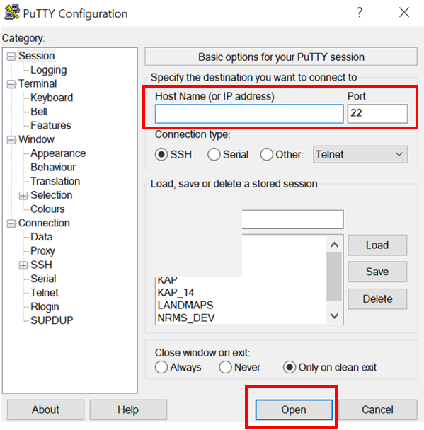 접속 정보는 SFTP 접속과 유사하게 Host Name과 Port : 22를 입력하고 Open 버튼을 클릭한다.