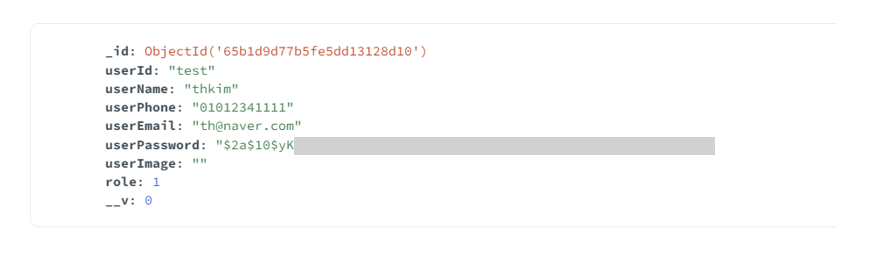 - salt + hash의 조합을 만들어서 user스키마의 userPassword에 암호화된 값을 다시 넣어준다.